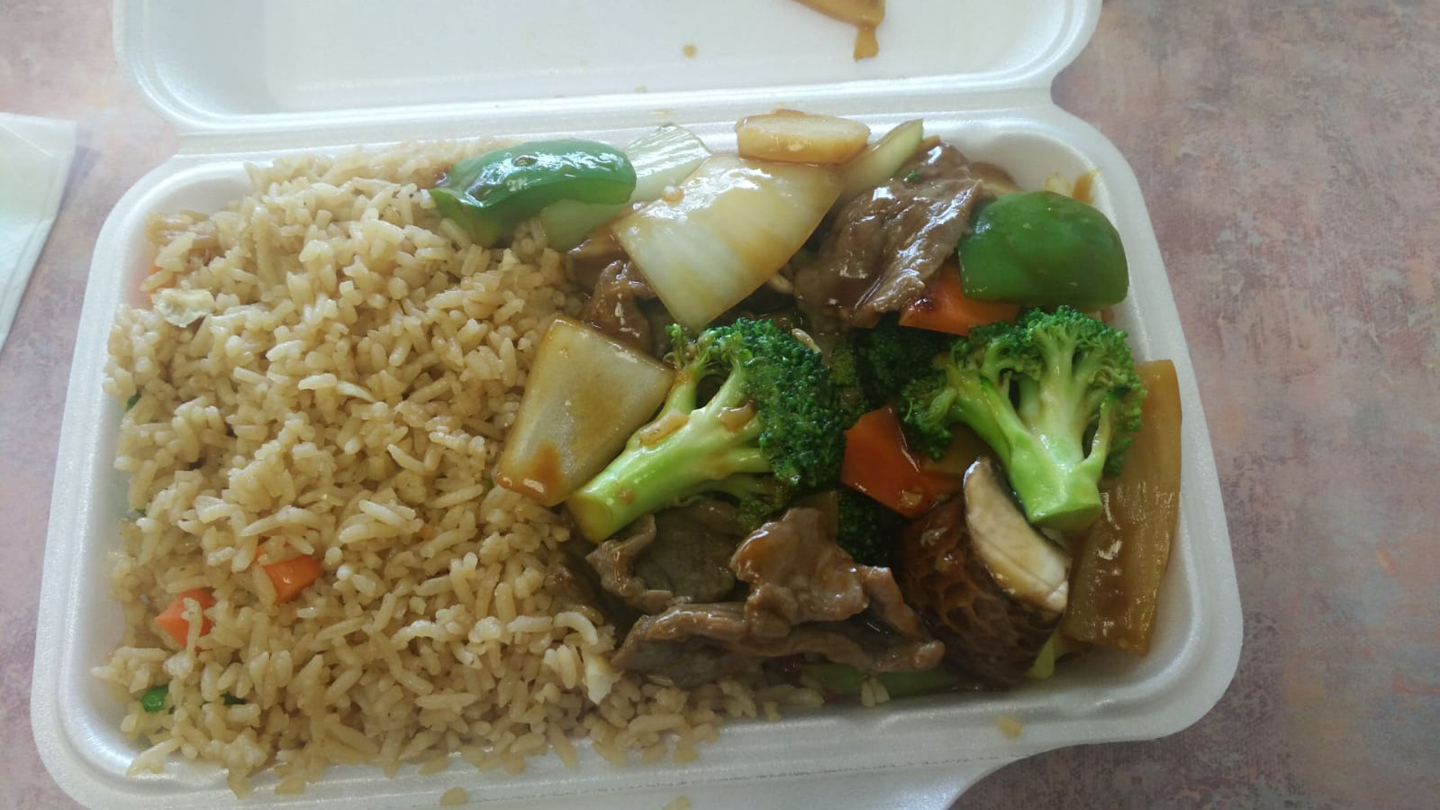 Aí fui comer. Queria alguma coisa diferente dos sanduíches do Tim Hortons, e resolvi ir num restaurante de comida chinesa que fica um pouco mais pra frente. Peço um misturado de legumes e carne, com arroz frito com frango. Primeira coisa: cheiro bom. Segunda coisa: 6.49. Terceira coisa: prato gigante. Quarta coisa: por 6.49, com refrigerante ou egg roll! Pedi o egg roll, que tou evitando refrigerante.
