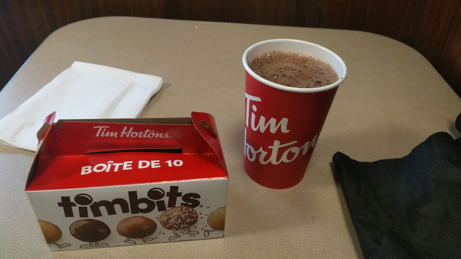 Com frio, já que estou tão molhado, resolvo finalmente provar uma comida “tradicional” do Tim Hortons: os Timbits (Fabíola, morra de inveja). Timbits são “os furos dos donuts”: bolinhas de massa frita, bem parecidos com os bolinhos de chuva do Brasil, mas com sabor um pouco diferente. Peguei os tradicionais, mais simples. Acho que a grande diferença é um pouco de cardamomo na massa, mas não tenho certeza. Depois investigo. Peço também um chocolate quente médio (que tem quase meio litro de chocolate – o MÉDIO. Povo aqui come muito).