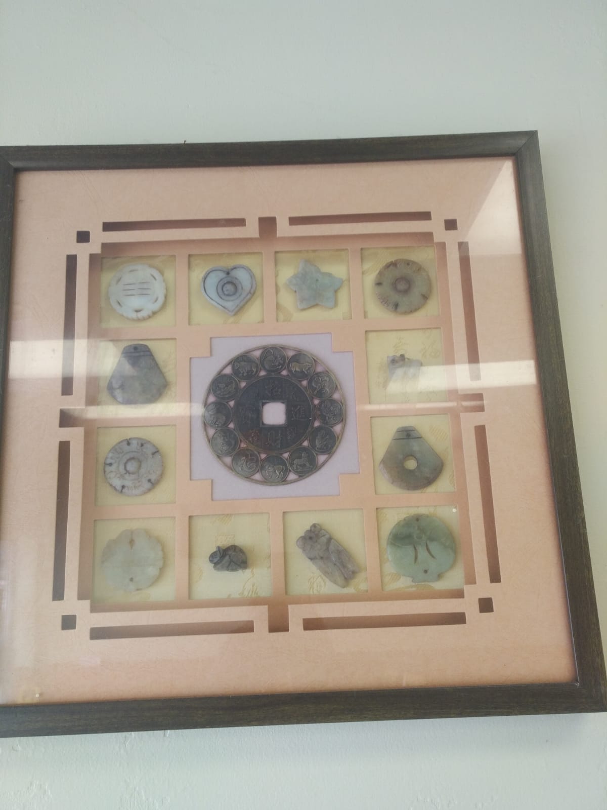 Enquanto esperava, fiquei vendo as decorações do restaurante. Uns entalhes em pedra, super lindos, trabalhos com metal, tudo muito legal. Quatro molduras espalhadas, com quatro coisas diferentes. Acho que tem a ver com Feng-shui. Tirei foto de uma só, com o zodíaco e umas pedras entalhadas em volta.