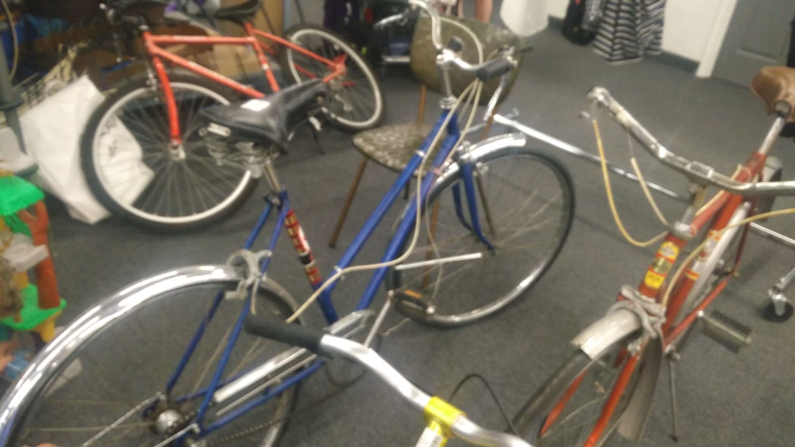 Aí chego numa parte que tem bicicletas. Três, pra ser exato. Uma azul, claramente mais velha que a Helô, precisando de uns reparos (inclusive com as marchas soltas e é um tipo que nunca tinha visto), uma de marcha única, vermelha, bem abandonada, e uma mountain bike mais nova que não parecia ter defeito nenhum, por 25 dólares canadenses. As outras duas eram vinte cada.