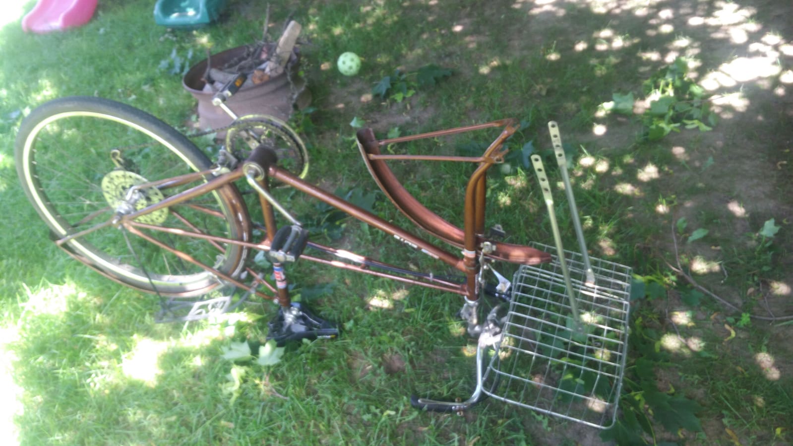 Reinstalei a roda e fui tirar a outra – muito mais difícil, claro, por causa das marchas. Depois de olhar até entender como funciona a marcha, consegui tirar e trocar o pneu. Dessa vez foi bem mais fácil, logicamente, porque a primeira já abriu caminho pela jângal da mecânica biciclética. Pneu e câmara trocados, instalo a roda de novo, ainda com certa dificuldade, e alinho tudo, dentro do possível. Como a Helô é bem baqueada, tudo nela parece desalinhado. Os paralamas, por exemplo, pendem cada um pra um lado. Não estão soltos, estão amassados, mesmo. Mas tudo bem.