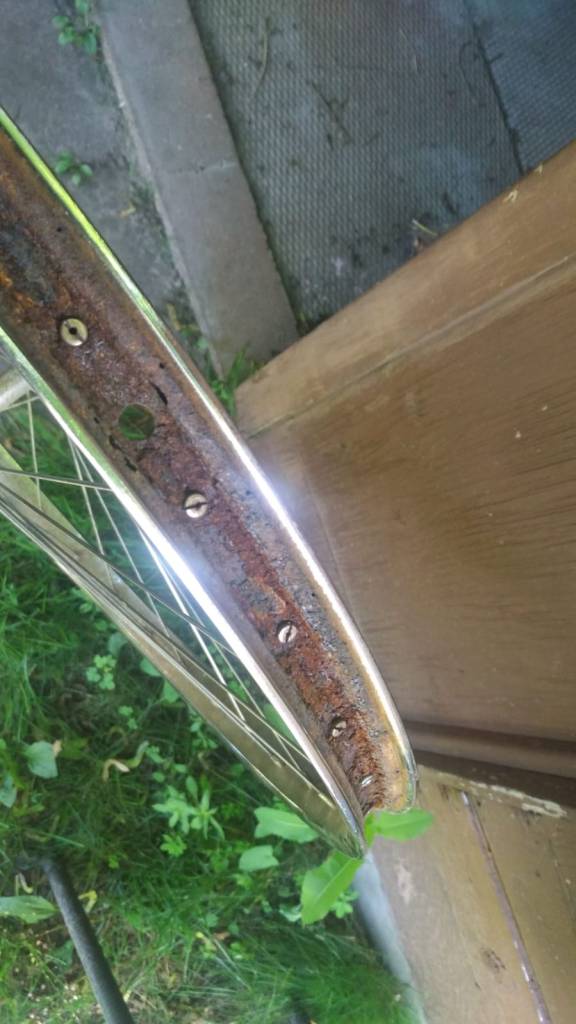 Com certa dificuldade, consigo tirar tudo e o exame me deixa bem triste: as rodas da Helô estão CHEIAS de ferrugem por dentro. Mas cheias, mesmo. Pelo visto, Helô ficou na chuva com pneus murchos. Não tenho como consertar isso agora. Não tenho ferramentas, materiais, espaço nem tempo – preciso dela funcionando. Então, só dou uma limpada e reinstalo o pneu.