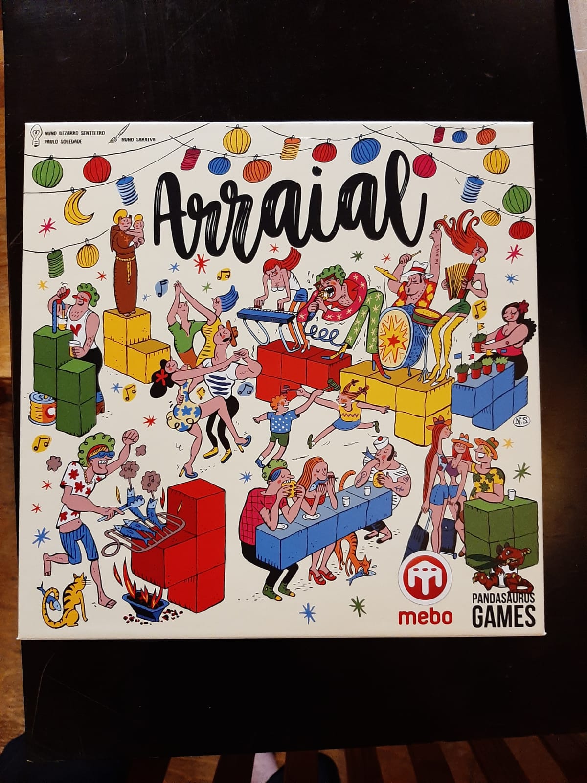Encontramos lá um jogo chamado Arraial – mas em inglês. É um jogo português em que os participantes precisam encaixar peças no tabuleiro pra atrair gente pra sua festa de rua – o arraial – ou pra sabotar a festa da rua do vizinho. Quem conseguir mais participantes na sua festa, ganha. Parece meio Tetris, meio Mau-mau (Uno ou seja lá o que for).